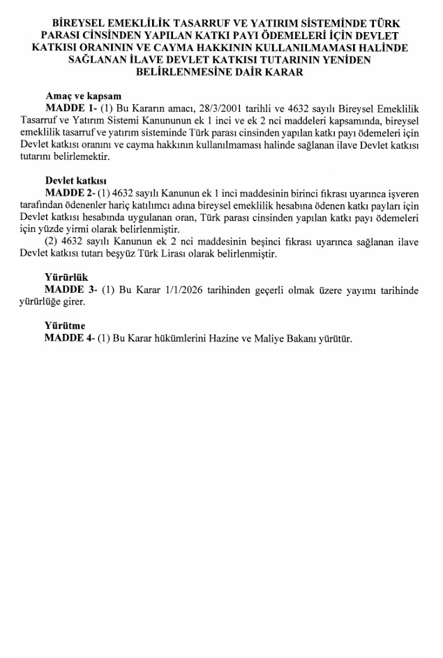 Yapılan düzenleme ile bundan sonraki süreçte Bireysel Emeklilik Sistemi’ne yatırılan katkı payları için devlet tarafından sağlanan destek, yeni oran üzerinden hesaplanacak. Mevcut sistemde, katılımcıların ödediği katkı payının belirli bir oranı devlet tarafından desteklenirken, bu destek oranı yüzde 30’dan yüzde 20’ye düşürülmüş oldu.