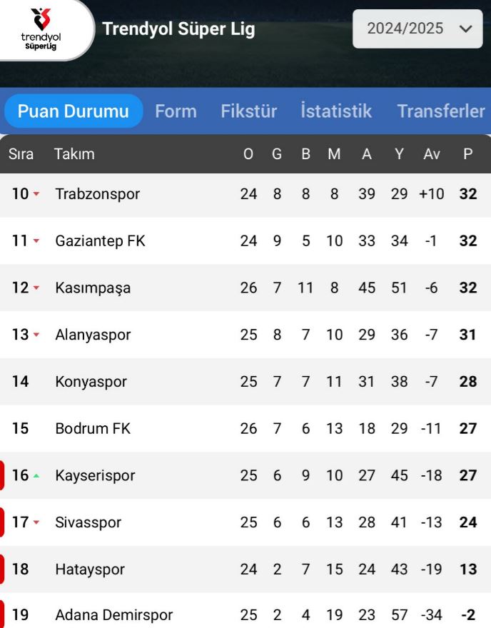 Düşme hattındaki rakipleri arasında en riskli durumda olan takım Sivasspor olarak görünüyor. 24 puanla ligin en düşük puanına sahip ekibi olan Sivasspor için yarın oynanacak Göztepespor karşılaşması kritik bir öneme sahip. Kümede kalma mücadelesi veren takımın, bu maçı kazanarak düşme hattından uzaklaşmak için önemli bir adım atması gerekiyor.