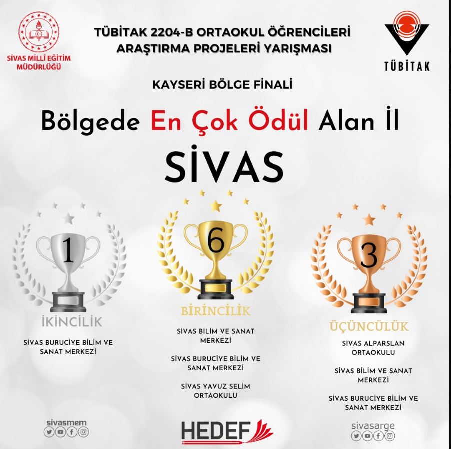 Yapılan paylaşımda: "TÜBİTAK 2204-B Ortaokul Öğrencileri Araştırma Projeleri Yarışması Kayseri Bölge finalinde en yüksek sayıda ödül alan il Sivas...