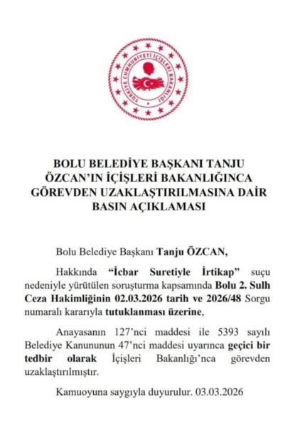İçişleri Bakanlığı tarafından yapılan açıklamada, Bolu Belediye Başkanı Tanju Özcan’ın Bolu 2. Sulh Ceza Hakimliği’nin 02.03.2026 tarihli kararıyla tutuklanması üzerine, Anayasa’nın 127’nci maddesi ve 5393 sayılı Belediye Kanunu’nun 47’nci maddesi uyarınca geçici bir tedbir olarak görevden uzaklaştırıldığı bildirildi.