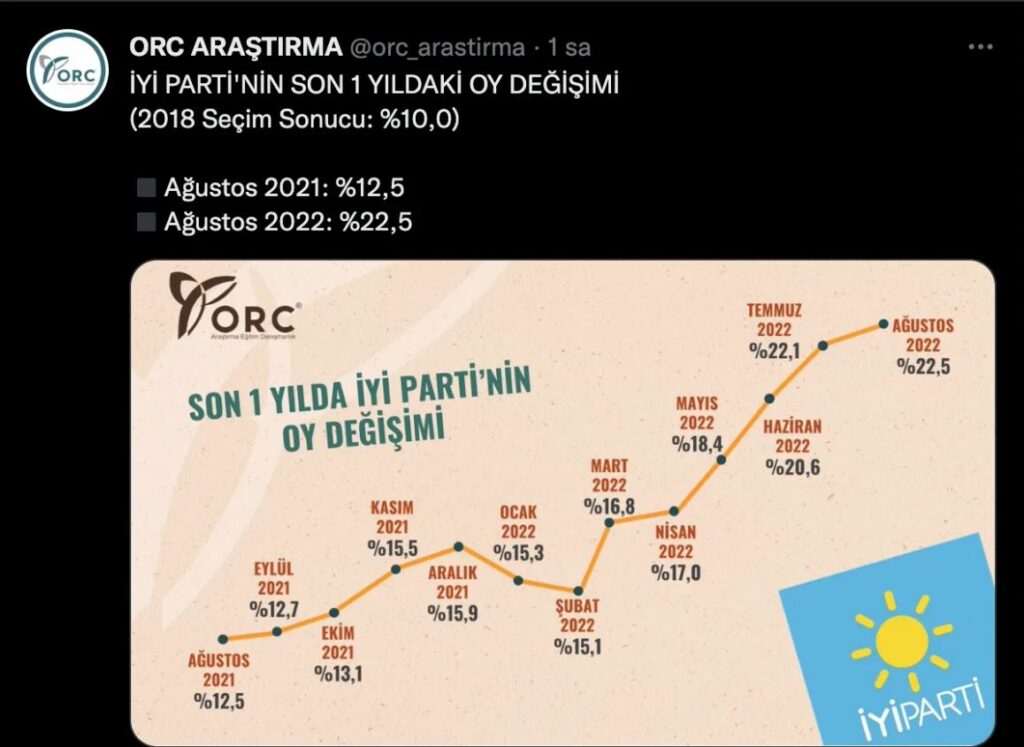 ORC Araştırma'ya göre 2018 seçimlerinde yüzde 10 oy alan İYİ Parti'nin oyları son bir yıl içerisinde çok sert yükseldi. Ağustos 2021'de oy oranını yüzde 12.5'e çıkaran İYİ Parti, son bir yılda oylarını yüzde 10 daha artırdı. Ağustos ayı anketine göre İYİ Parti'nin oy oranı yüzde 22.5'i gördü. Böylece İYİ Parti 2018 seçimlerinden bu yana oylarını yüzde 125 artırmış oldu.