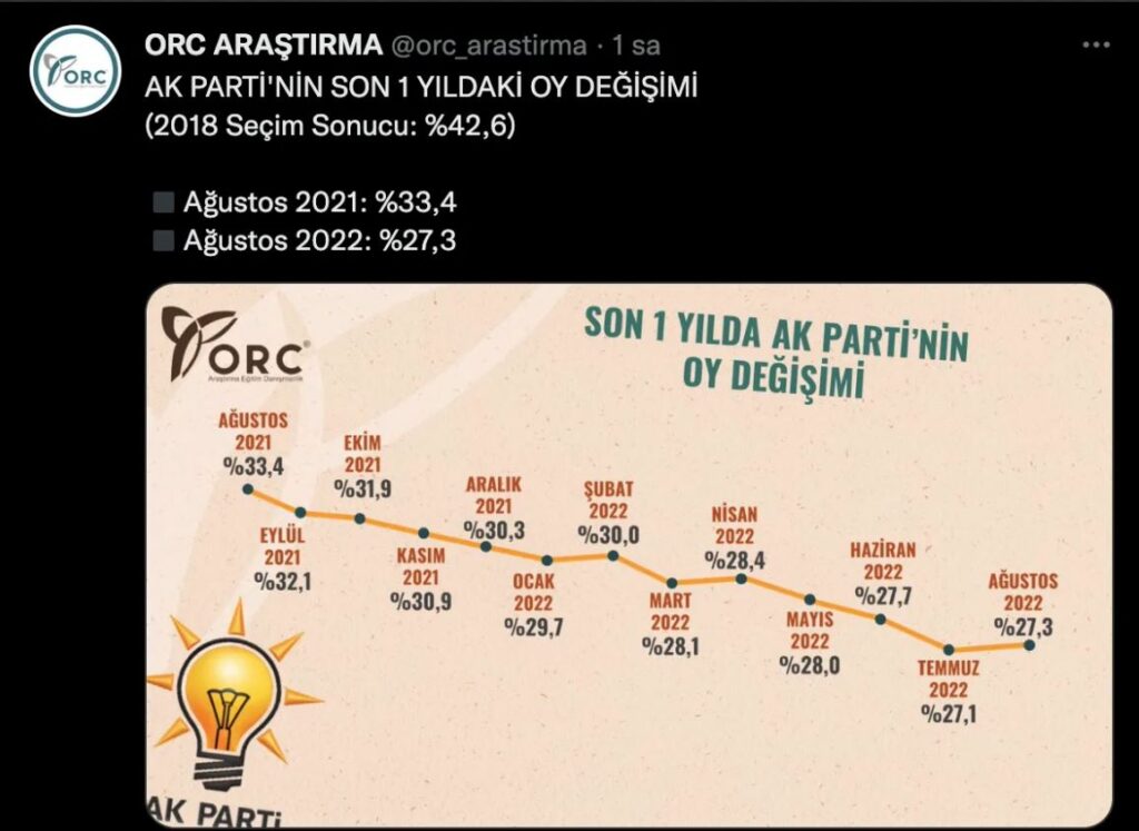 ORC'nin araştırmasına göre AK Parti'nin 2018 seçimlerinde yüzde 42.6 olan oy oranı Ağustos 2021'de yüzde 33.4'e, Ağustos 2022'de ise yüzde 27,3'e geriledi. AK Parti'nin oylarında Ağustos 2022'de hafif bir toparlanma görüldü.