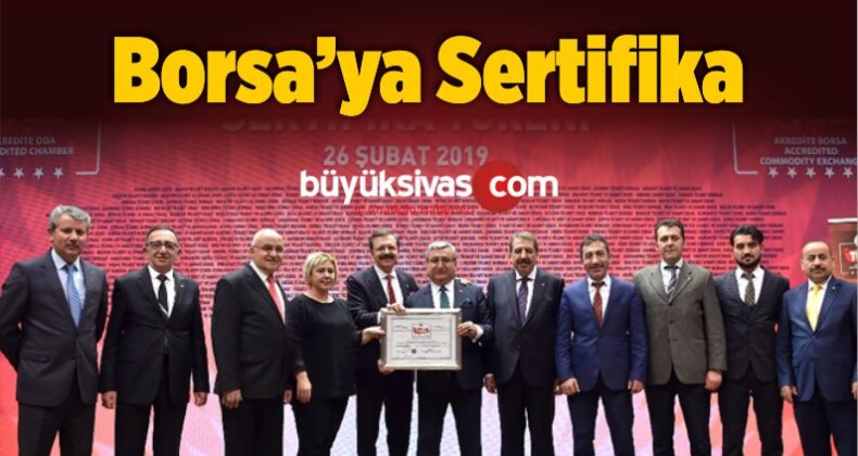 Konuşmaların ardından sertifika törenine geçildi. Sivas Ticaret Borsası´nın sertifikasını; Sivas Ticaret Borsası Yönetim Kurulu Başkanı Abdulkadir Hastaoğlu, Yönetim Kurulu Üyeleri Hilmi Gül, Tahsin Gülbahar, Tarık Günhan, Haluk Yağcı, Meclis Üyesi Engin Ekşioğlu, Sami Aygül, Genel Sekreter Sema Görcün ile Akreditasyon Sorumlusu Ahmet Kaçmaz, TOBB Başkanı M. Rifat Hisarcıklıoğlu´nun elinden aldılar.