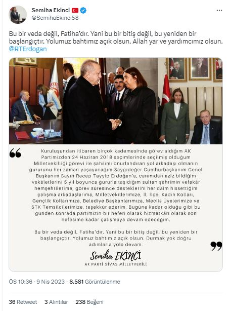 Dün Yüksek Seçim Kuruluna teslim edilen aday listesinde ismi yer almayan Semiha Ekinci sosyal medya hesabından yaptığı açıklamada: "Bu bir veda değil, Fatiha’dır. Yani bu bir bitiş değil, bu yeniden bir başlangıçtır. Yolumuz bahtımız açık olsun. Allah yar ve yardımcımız olsun. " ifadelerine yer verdi.