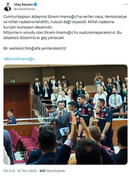 Verilen karara CHP Sivas Milletvekili Ulaş Karasu da sosyal medya hesabından tepki gösterdi. Karasu, “Cumhurbaşkanı adayımız Ekrem İmamoğlu’na verilen ceza, demokrasiye ve millet iradesine tehdittir. Bu karar hukuki değil, siyasidir. Milyonların umudu olan İmamoğlu’nu susturamayacaksınız. Bu adaletsiz düzeniniz er geç yıkılacak!” ifadelerini kullandı.