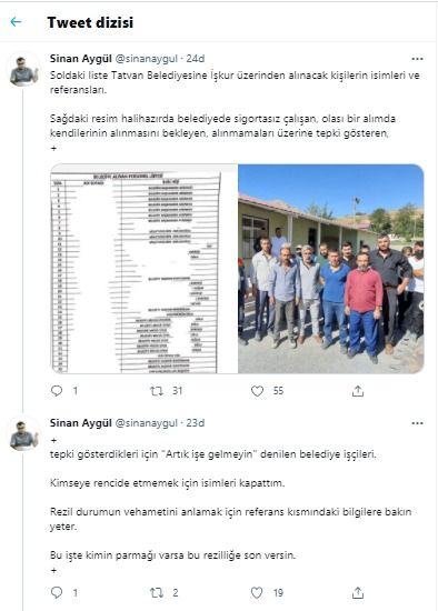 Gazeteciler Cemiyeti Başkanı gazeteci Sinan Aygül, Tatvan Belediyesi'ndeki işe alımlarda kullanılan torpilin listesini sosyal medya hesabından "rezil ederim" notuyla paylaştı.