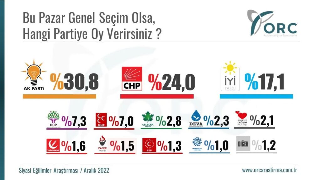 ORC anket şirketi Aralık ayının ilk haftasında da kadın erkek ayrımı yapmadan bir genel anket yaptı. Bu anket 3-6 Aralık 2022 tarihlerinde, 42 ilde 3670 kişi ile yüz yüze yapılan anketin sonuçları ise şöyle: