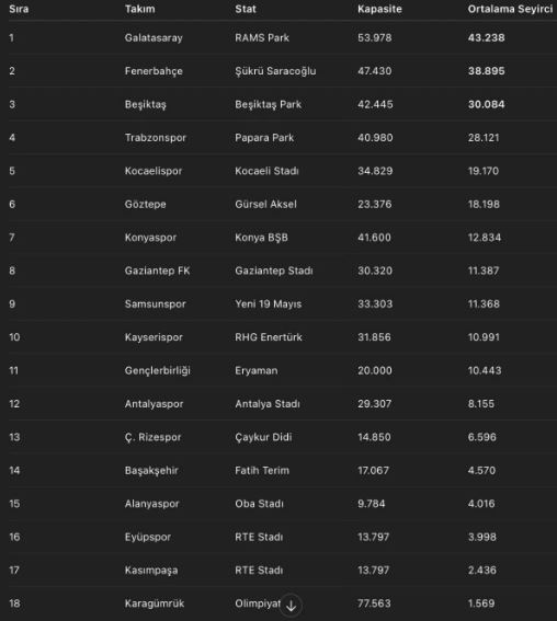 RAMS Park’ı, Fenerbahçe’nin iç saha maçlarını oynadığı Chobani Stadyumu takip etti. Sarı-lacivertlilerin stadında bu sezon maç başına ortalama yaklaşık 38 bin 895 futbolsever tribünlerde yer aldı. Üçüncü sırada ise Trabzonspor’un Papara Park’ı bulunuyor. Bordo-mavili ekibin sahasında karşılaşmaları ortalama 28 bin 121 taraftar izledi.
