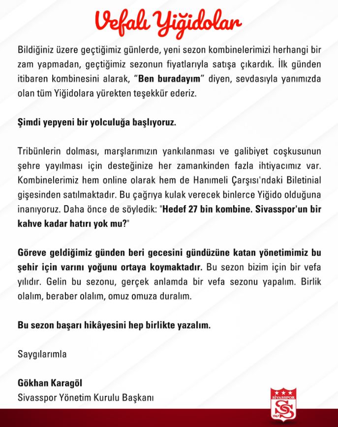 Kombine biletlerin hem online olarak hem de Sivas’taki Hanımeli Çarşısı'ndaki Biletinial gişesinden satışa sunulduğunu hatırlatan Karagöl, “Bu çağrıya kulak verecek binlerce Yiğido olduğuna inanıyoruz. Daha önce de söyledik: 'Hedef 27 bin kombine. Sivasspor'un bir kahve kadar hatırı yok mu?'” diyerek destek çağrısını yineledi.