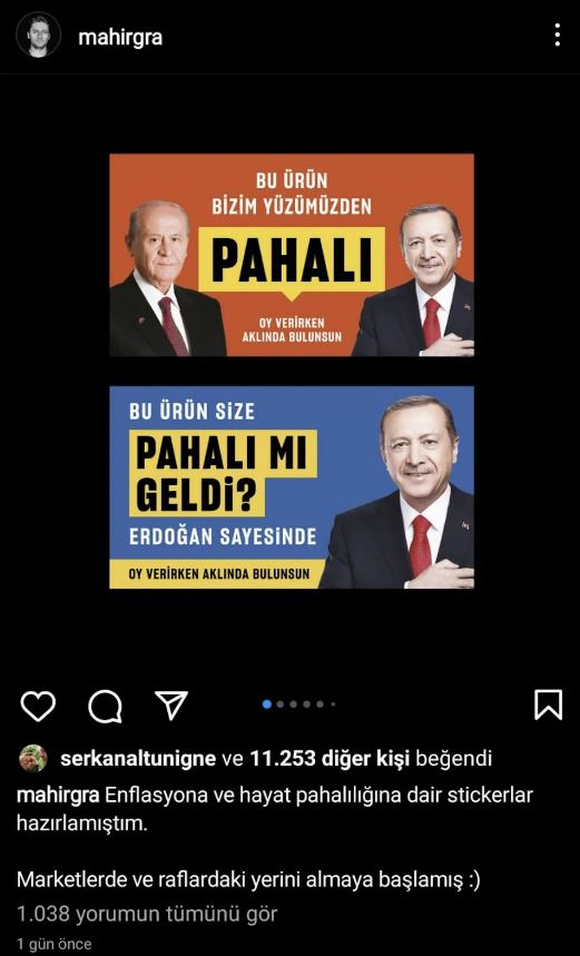 14 Mayıs seçimlerine giderken, marketlerde ürünlerin üzerine “Bu ürün size pahalı mı geldi? Erdoğan sayesinde" çıkartmaları yapıştırılmaya başlandı. O çıkartmaları hazırlayan görsel iletişim tasarımcısı Mahir Akkoyun gözaltına alındığını duyurdu.