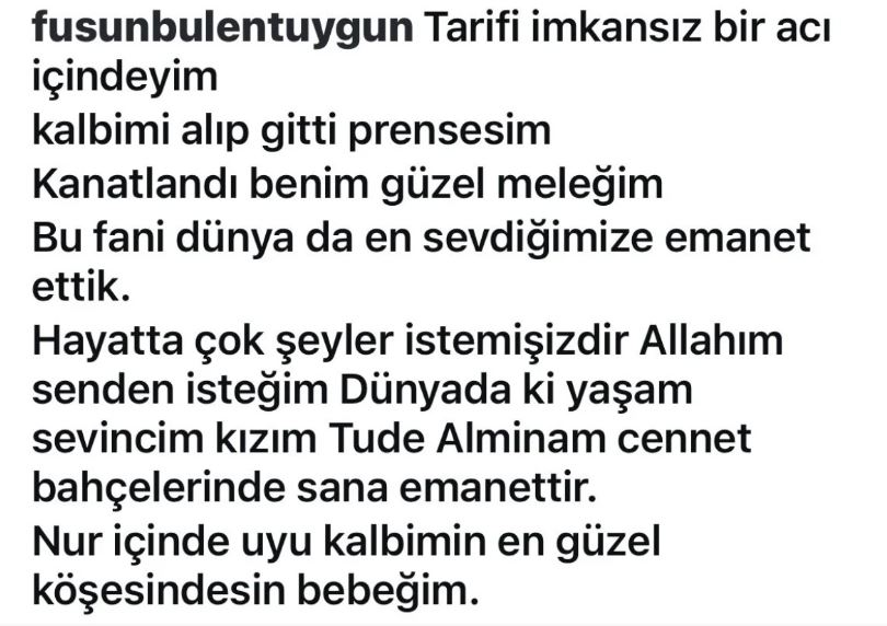 "Tarifi mümkün olmayan bir acı yaşıyorum. Kalbimi alıp götürdü prensesim. Kanatlandı ve melek oldu benim güzel kızım. Bu fani dünyada en sevdiğimize emanet ettim onu. Rabbimden tek dileğim, yaşam sevincim Almina Tude’yi cennetinin en güzel bahçelerine kabul etmesi. Nur içinde uyu benim güzel bebeğim, kalbimin en özel köşesindesin."