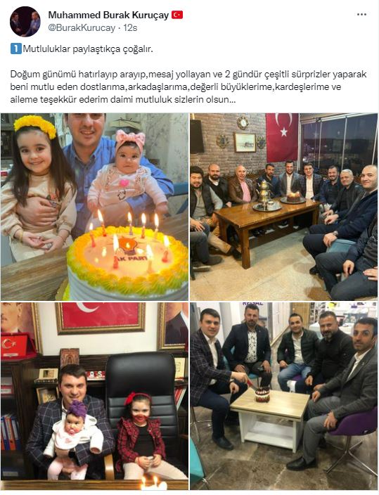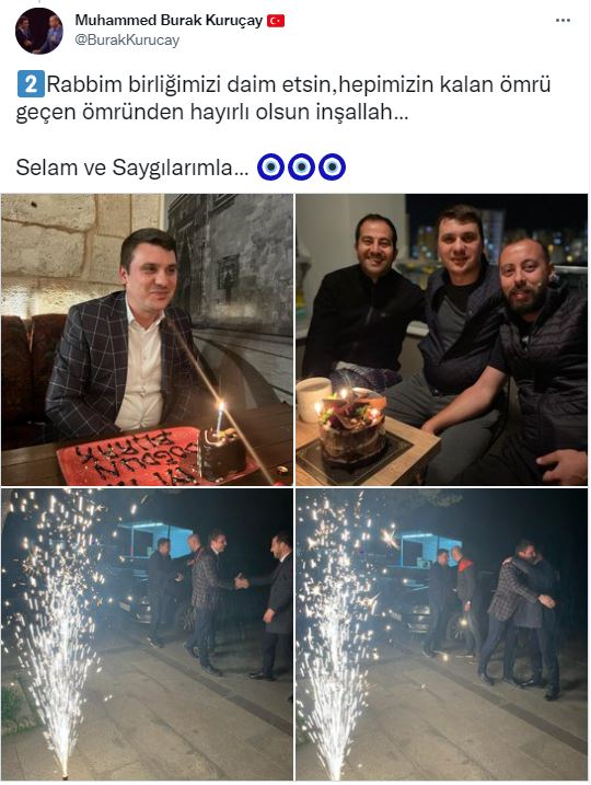 "Mutluluklar paylaştıkça çoğalır. Doğum günümü hatırlayıp arayıp,mesaj yollayan ve 2 gündür çeşitli sürprizler yaparak beni mutlu eden dostlarıma, arkadaşlarıma, değerli büyüklerime, kardeşlerime ve aileme teşekkür ederim daimi mutluluk sizlerin olsun… Rabbim birliğimizi daim etsin, hepimizin kalan ömrü geçen ömründen hayırlı olsun inşallah… Selam ve Saygılarımla…"