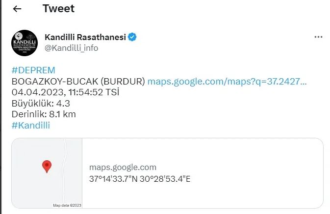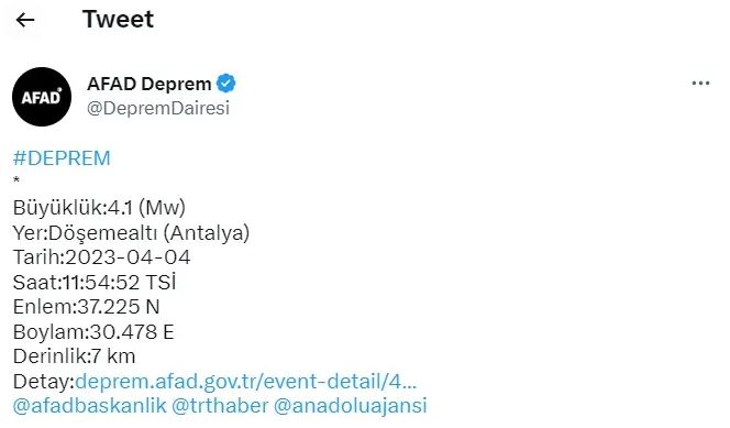 Öte yandan AFAD da saat 11.54'te Antalya'nın Döşemealtı ilçesinde 4.1 büyüklüğünde deprem olduğu belirtildi.