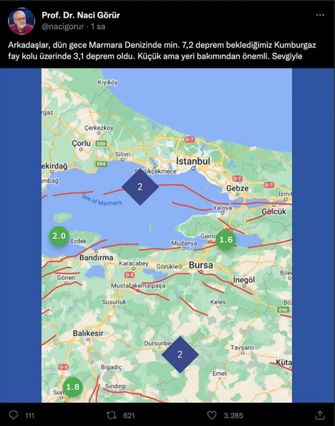 "Arkadaşlar, dün gece Marmara Denizinde min. 7,2 deprem beklediğimiz Kumburgaz fay kolu üzerinde 3,1 deprem oldu. Küçük ama yeri bakımından önemli. Sevgiyle."