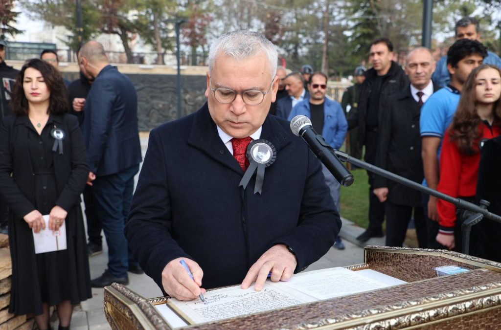 Şeref defterine yazdığı anma mesajını okuyan Vali Şimşek; "Temellerini Sivas’ta attığınız, benzersiz kurtuluş mücadelesinin ardından kurduğunuz Cumhuriyeti, sarsılmaz azminizi ve vatan aşkınızı örnek alarak ilelebet yaşatmanın bilincinde ve kararlılığındayız. Bize bıraktığınız emaneti hedefine ulaştırmak için bundan sonra da inançla ve azimle çalışmaya devam edeceğiz. Sizi, silah arkadaşlarınızı ve tüm şehitlerimizi rahmet, minnet ve şükranla anıyoruz." dedi. (Halil Yavuz Canpolat)