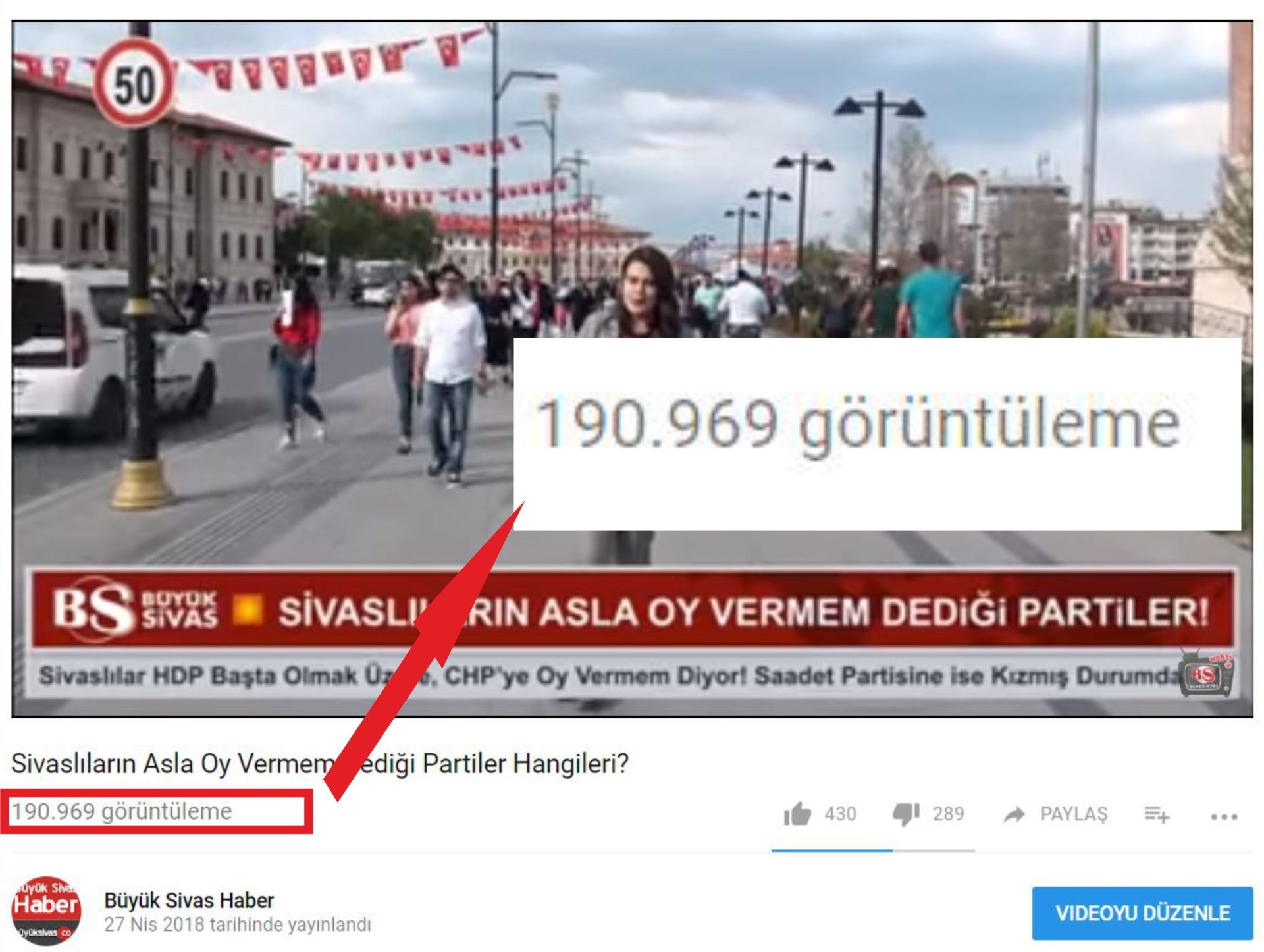 Geçtiğimiz hafta gerçekleştirdiğimiz "Sivaslıların Asla Oy Vermem Dediği Partiler Hangileri?" Sokak Röportajımız an itibariyle sadece Youtube Kanalımız üzerinde "190.696 görüntüleme" almış durumda.