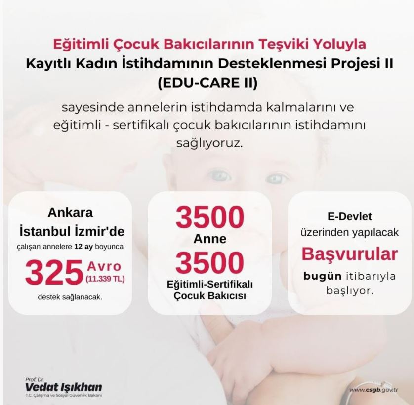“Çocuk bakım sorumlulukları nedeniyle istihdamdan uzaklaşmanın önüne geçmek için anneleri destekliyor, kayıtlı istihdamda kalmalarını sağlıyoruz. Projemizin ikinci dönemine başvurular bugün itibarıyla başlıyor. Proje kapsamında, Ankara, İstanbul ve İzmir'de, 12 ay boyunca çalışan annelere 325 euro (11 bin 339 lira) destek sağlanacak. Eğitimli ve sigortalı çocuk bakıcılığının teşvikini de sağlamayı hedeflediğimiz projeden toplam 7 bin kadın faydalanacak”. (İHA)