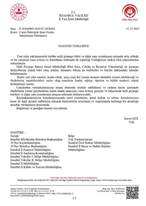 İstanbul Valiliği, Davut Gül, cami önleri, milli piyango, şans oyunları, yasak, genelge
