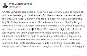 UYARI: Bu Çanakkale depremi nedeniyle uyarıyorum. Özellikle hükümet, muhalefet ve halk şunu idrak etmeli. Bu ülkenin hemen hemen her yeri bir fay örgüsüyle kaplı. Ülkenin herhangi bir bölgesi her hangi bir zamanda büyük bir depreme maruz kalabilir ve binlerce insanımız ölebilir. Bu çok ciddi bir olasılıktır.