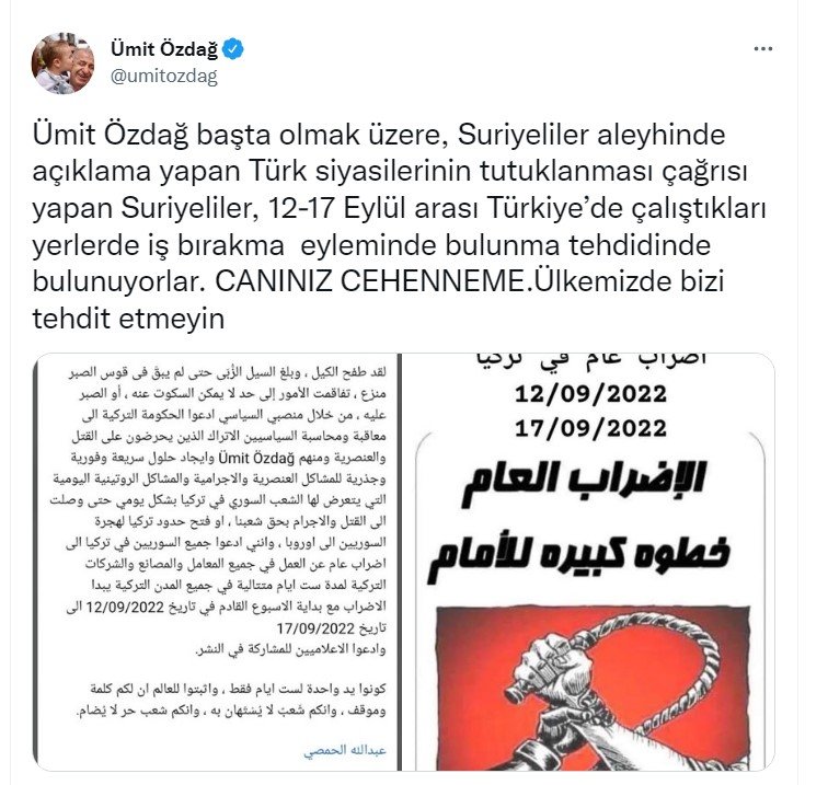 Zafer Partisi lideri, şu mesajı paylaştı: Ümit Özdağ başta olmak üzere, Suriyeliler aleyhinde açıklama yapan Türk siyasilerinin tutuklanması çağrısı yapan Suriyeliler, 12-17 Eylül arası Türkiye'de çalıştıkları yerlerde iş bırakma eyleminde bulunma tehdidinde bulunuyorlar. Canınız cehenneme. Ülkemizde bizi tehdit etmeyin.