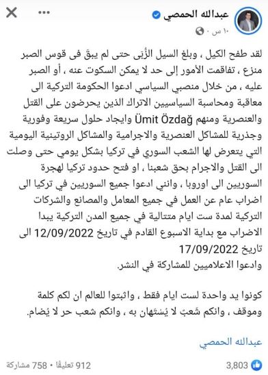 "Yeter artık, sağanak yağmur sabrın kıvılcımını yitirmeyene kadar ulaştı. İşler tahammül edilemeyecek, tahammül edilemeyecek boyutlara ulaştı.Benim siyasi duruşumla Türk hükümetine Türk siyasetçilerini cezalandırması ve tutuklaması çağrısında bulundular. Ümit Özdağ da dahil olmak üzere cinayeti ve ırkçılığı kışkırtan ve çözüm bulanlardan hesap sorulmalıdır.Türkiye'deki Suriye halkının günlük olarak maruz kaldığı hızlı, acil ve radikal ırkçı ve kriminal sorunlar ile cinayet ve suçluluğa ulaşana kadar günlük rutin sorunlar. Suriyelilerin Avrupa'ya göçü için Türkiye'nin sınırlarını açan ve Türkiye'deki tüm Suriyelileri tüm fabrika ve fabrikalarda ve Türk şirketlerini altı gün üst üste tüm Türkiye illerinde genel greve çağırıyorum. gelecek hafta 12/09/2022'den 17/09/2022'ye kadar Medyayı yayına katılmaya davet ettiler.