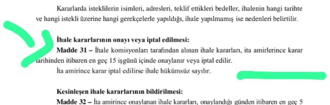 2886 kanuna göre İhale kararlarının onayı ve iptal edilmesi "İhale komisyonları tarafından alınan ihale kararları, ita amirlerince karar tarihinden itibaren en geç 15 işgünü içinde onaylanır veya iptal edilir. İta amirince karar iptal edilirse ihale hükümsüz sayılır." denilmektedir.