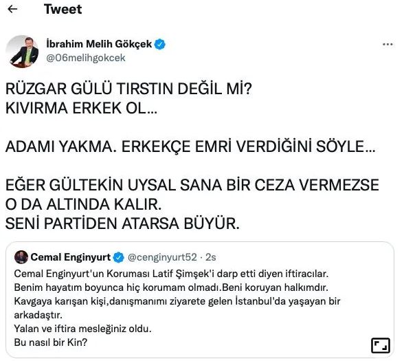 Canlı yayında Latif Şimşek ile gerginlik yaşayan Cemal Enginyurt'un koruması Şimşek'i darp etmişti. Olay sonrası Twitter hesabından paylaşım yapan Demokrat Partili Enginyurt'a Ankara eski Büyükşehir Belediye Başkanı Melih Gökçek'ten tepki geldi. Gökçek, "Rüzgar gülü tırstın değil mi? Kıvırma erkek ol... Adamı yakma. Erkekçe emri verdiğini söyle" dedi.