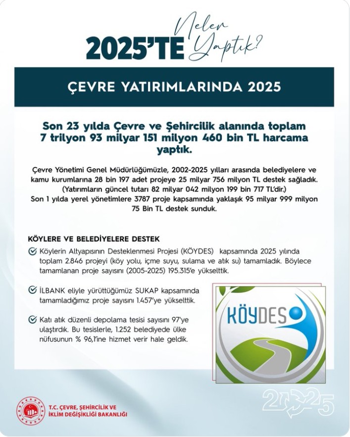 Bakanlık tarafından yapılan açıklamaya göre, son 23 yılda çevre ve şehircilik alanında toplam 7 trilyon 93 milyar 151 milyon 460 bin TL harcama gerçekleştirildi. Çevre Yönetimi Genel Müdürlüğü koordinesinde 2002–2025 yılları arasında belediyelere ve kamu kurumlarına toplam 28 bin 197 proje için 25 milyar 756 milyon TL destek sağlandı. Bu yatırımların güncel tutarının ise 82 milyar 42 milyon 109 bin 717 TL’ye ulaştığı bildirildi.