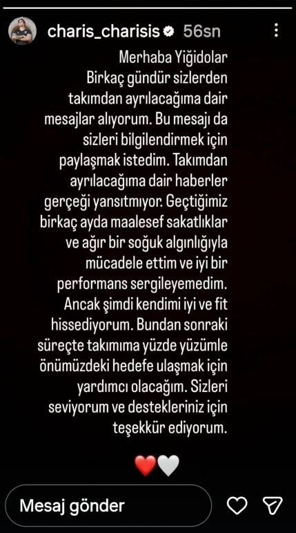 Charisis paylaşımında, son aylarda yaşadığı sakatlıklar ve ağır bir soğuk algınlığı nedeniyle istediği performansı sergileyemediğini belirterek, bu durumun transfer söylentilerine neden olmuş olabileceğini dile getirdi. Ancak şu anda kendisini iyi hissettiğini vurgulayan Yunan futbolcu, bundan sonraki süreçte takımına daha güçlü bir şekilde katkı sağlamak istediğini söyledi.