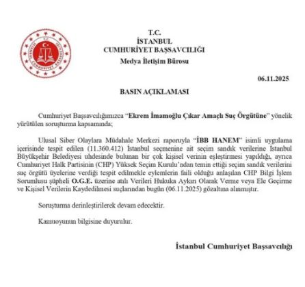 “Cumhuriyet Başsavcılığımızca ‘Ekrem İmamoğlu çıkar amaçlı suç örgütüne’ yönelik yürütülen soruşturma kapsamında; Ulusal Siber Olaylara Müdahale Merkezi (USOM) raporuyla ‘İBB HANEM’ uygulaması içinde tespit edilen 11 milyon 360 bin 412 İstanbul seçmenine ait verilerin, İstanbul Büyükşehir Belediyesi uhdesinde bulunan kişisel verilerle eşleştirildiği belirlenmiştir. Ayrıca CHP’nin Yüksek Seçim Kurulu’ndan (YSK) temin ettiği seçim sandık verilerini suç örgütü üyelerine verdiği tespit edilmiştir. Bu eylemler kapsamında CHP Bilgi İşlem Sorumlusu şüpheli O.G.E. hakkında işlem yapılmış ve 6 Kasım 2025 tarihinde gözaltına alınmıştır. Soruşturma derinleştirilerek devam etmektedir.”