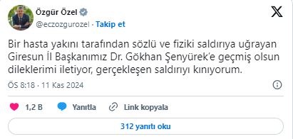 Özel, sosyal medya hesabından yaptığı paylaşımda, "Bir hasta yakını tarafından sözlü ve fiziki saldırıya uğrayan Giresun İl Başkanımız Dr. Gökhan Şenyürek'e geçmiş olsun dileklerimi iletiyor, gerçekleşen saldırıyı kınıyorum." ifadesini kullandı.