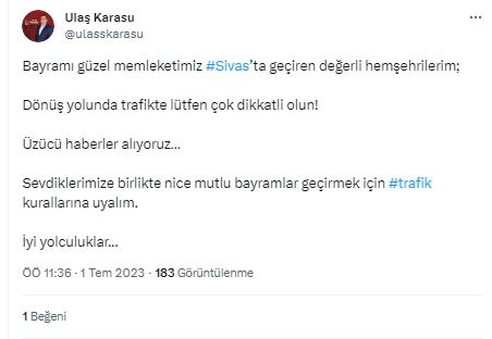 Milletvekili Karasu yaptığı açıklamada: "Bayramı güzel memleketimiz Sivas’ta geçiren değerli hemşehrilerim;