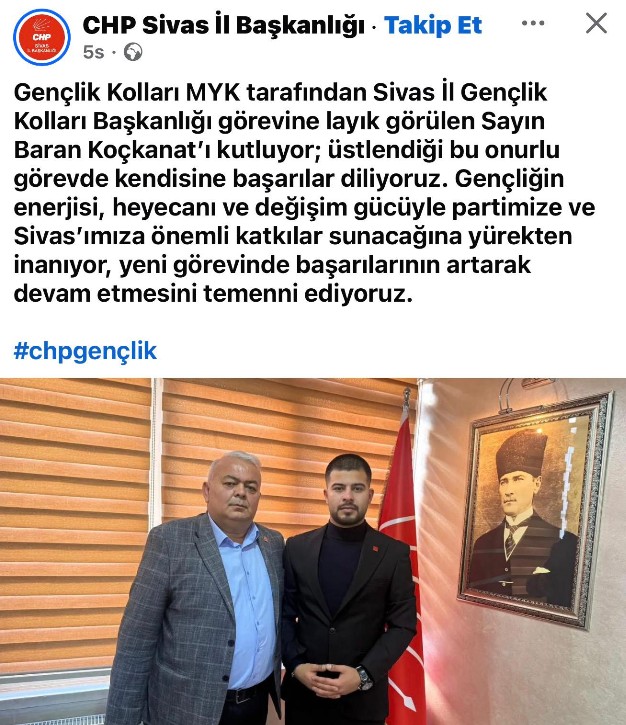 Yeni görevinde Baran Koçkanat’ın başarılarının artarak devam etmesi temennisinde bulunulurken, CHP Sivas İl Başkanlığı tarafından kendisine destek mesajı iletildi.