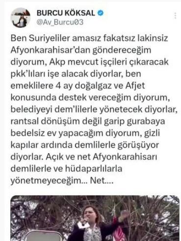 Karşılıklı söylemlerinin ardından sosyal medya hesabından bir açıklama yapan Köksal ise “Ben Suriyeliler amasız fakatsız lakinsiz Afyonkarahisar’dan göndereceğim diyorum, AKP mevcut işçileri çıkaracak PKK’lıları işe alacak diyorlar, ben emeklilere 4 ay doğalgaz ve AFJET konusunda destek vereceğim diyorum. Belediyeyi DEM’lilerle yönetecek diyorlar, rantsal dönüşüm değil garip gurabaya bedelsiz ev yapacağım diyorum. Gizli kapılar ardında DEM’lilerle görüşüyor diyorlar. Açık ve net Afyonkarahisar’ı DEM’lilerle ve HÜDAPAR’lılarla yönetmeyeceğim. Net” şeklinde bir açıklama yaparak, sözlerinin arkasında durduğunu gösterdi. (İHA)