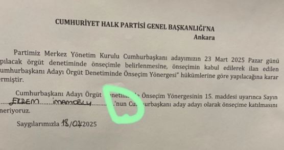 Öte yandan, CHP TBMM Grubu tarafından hazırlanan cumhurbaşkanlığı aday adaylığı öneri formu dikkat çekti. Formda isim yazılacak bölümün "......... ......... 'nun" şeklinde boş bırakıldığı ancak sadece Ekrem İmamoğlu'nun isminin bu forma uyduğu görüldü.