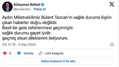 Bülbül, sosyal medyadan yaptığı paylaşımda, "Aydın Milletvekilimiz Bülent Tezcan’ın sağlık duruma ilişkin çıkan haberler doğru değildir. Basit bir gıda zehirlenmesi geçirmiştir. sağlık durumu gayet iyidir. geçmiş olsun dileklerimi iletiyorum" dedi.