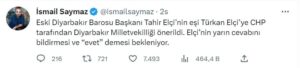 Gazeteci İsmail Saymaz, kişisel Twitter hesabı üzerinden yaptığı paylaşımda, "Eski Diyarbakır Barosu Başkanı Tahir Elçi’nin eşi Türkan Elçi’ye CHP tarafından Diyarbakır Milletvekilliği önerildi. Elçi’nin yarın cevabını bildirmesi ve 'evet' demesi bekleniyor" bilgisini verdi.