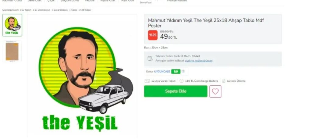 ciceksepeti.com isimli sitede “yeşil” kod isimli Mahmut Yıldırım ve Toros logosunu taşıyan hediyelik ürün 49.90 TL'de satılıyor. "Mahmut Yıldırım Yeşil The Yeşil 25x18 Ahşap Tablo Mdf Poster" ismini taşıyan "hediyelik eşyanın" 69.90 TL'den indirime girdiği görülüyor.