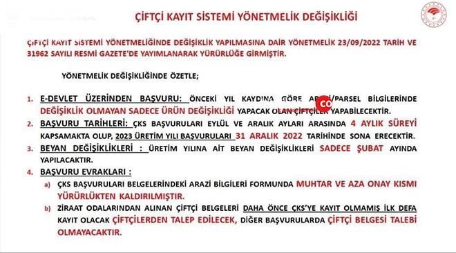 2023 Üretim Yılına ait beyan değişikliklerinin sadece Şubat ayında yapılacağı açıklanan düzenlemede, Çiftçi Kayıt Sistemi (ÇKS)'nde bulunan muhtar ve aza onay kısmının kaldırıldı belirtildi.