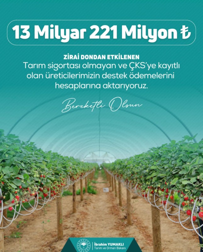 “Zirai dondan etkilenen üreticilerimizin yanında olmayı sürdürüyoruz. Tarım sigortası bulunmayan ancak Çiftçi Kayıt Sistemi’ne kayıtlı üreticilerimize ilk etapta 13 milyar 221 milyon TL destek ödemesi yapıyoruz. Üreticimizin emeğini koruyarak, tarımsal üretimde sürdürülebilirliği ve kırsal kalkınmayı güçlendirmeye devam ediyoruz.”