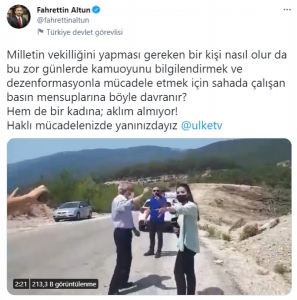 Basın mensuplarının haklı mücadelesinde yanlarında olduklarını belirten Altun, "Milletin vekilliğini yapması gereken bir kişi nasıl olur da bu zor günlerde kamuoyunu bilgilendirmek ve dezenformasyonla mücadele etmek için sahada çalışan basın mensuplarına böyle davranır? Hem de bir kadına; aklım almıyor! Haklı mücadelenizde yanınızdayız" dedi.