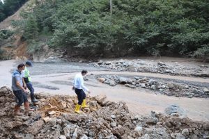 Sivas İl Özel İdaresine bağlı ekiplerin Giresun ili Dereli ilçesinde yaptığı çalışmaları da inceleyen Vali Salih Ayhan, buradan selin geldiği Akkaya köyüne geçti.