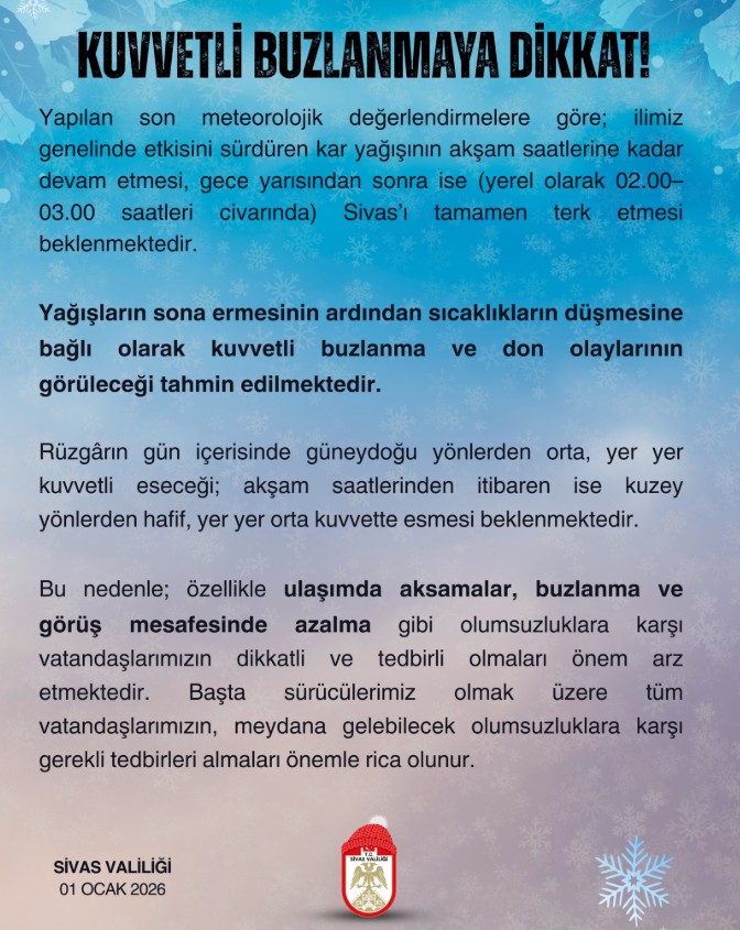 Yapılan son meteorolojik değerlendirmelere göre, Sivas genelinde devam eden kar yağışının akşam saatlerine kadar süreceği, gece yarısından sonra ise kenti tamamen terk etmesinin beklendiği bildirildi. Yağışların sona ermesinin ardından hava sıcaklıklarının hızla düşeceği ve buna bağlı olarak kuvvetli buzlanma ile don olaylarının görülebileceği belirtildi.