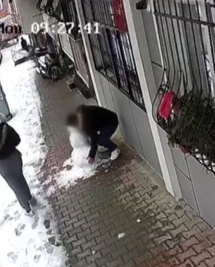 Şahsın kardan adamı yerinden söktüğü sırada yapının bir bölümünün dağıldığı görüldü. Yaşananlar, çevredeki bir iş yerinin güvenlik kamerası tarafından saniye saniye kaydedildi.