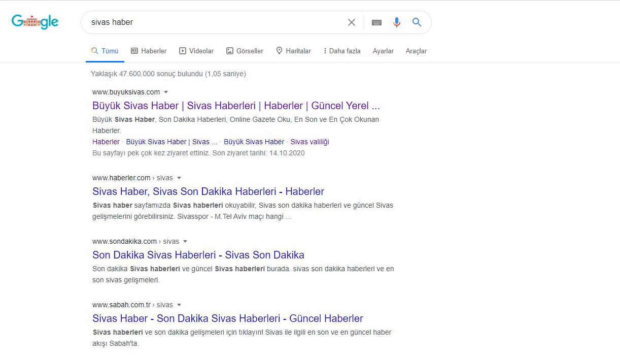 Dünyada durum buyken Sivas'ta ise tartışmasız en çok aranan biziz... Sivas'ta sivas haber aramasınında tartışmasız ve organik olarak birincisi olan buyuksivas.com ayrıca Sivas'ın protokol üyeleri, siyasileri, kurumları vb. aramalarda da ilk sırada yer alıyor... buyuksivas.com'a ise Sivas yerelinden maalesef herhangi bir rakip yer almıyor. Google arama sıralamalarında olan diğer tüm portallar ise maalesef ulusal...