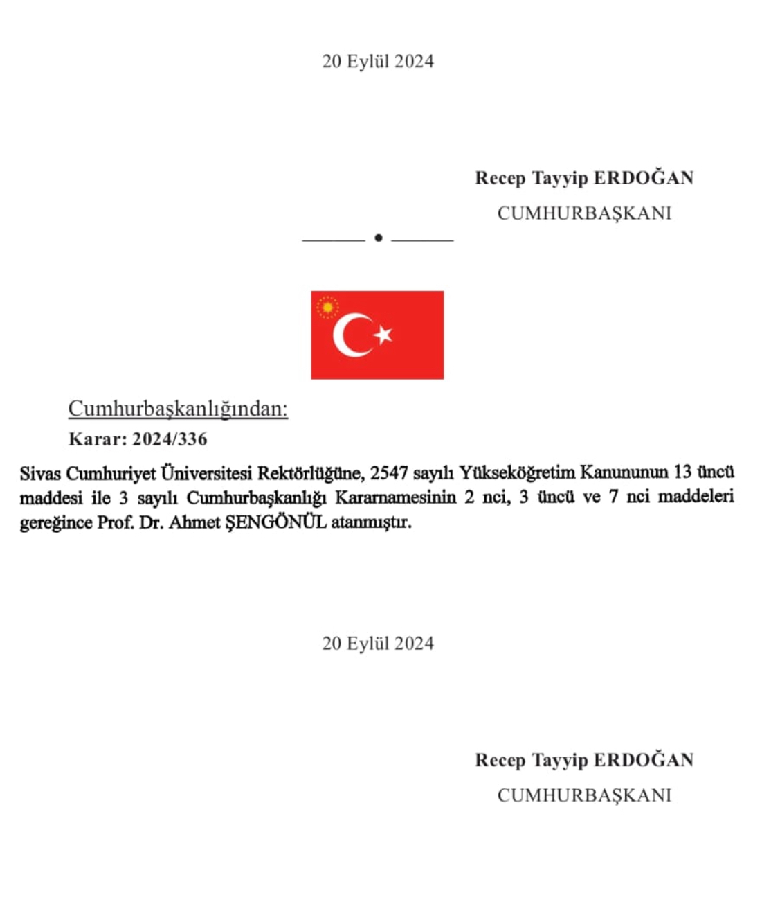 Cumhurbaşkanı Recep Tayyip Erdoğan'ın imzasıyla yayımlanan Resmi Gazete kararına göre, Sivas Cumhuriyet Üniversitesi'nin yeni rektörü olarak Prof. Dr. Ahmet Şengönül atandı. Sivas Cumhuriyet Üniversitesi İktisadi ve İdari Bilimler Fakültesi Ekonometri Bölümü'nde görev yapan Prof. Dr. Şengönül, rektörlük görevine getirilirken, bu atama şehirde farklı yorumlara neden oldu.