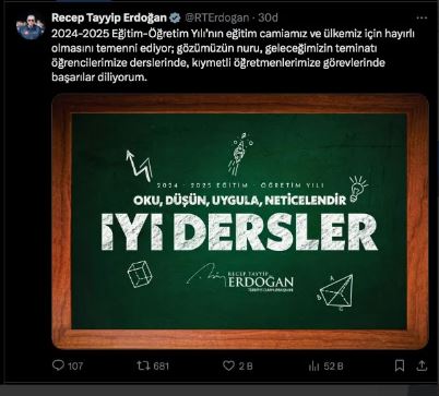 Cumhurbaşkanı Erdoğan, sosyal medya hesabından yaptığı paylaşımda, "2024-2025 Eğitim-Öğretim Yılı'nın eğitim camiamız ve ülkemiz için hayırlı olmasını temenni ediyor, gözümüzün nuru, geleceğimizin teminatı öğrencilerimize derslerinde, kıymetli öğretmenlerimize görevlerinde başarılar diliyorum." ifadelerini kullandı.