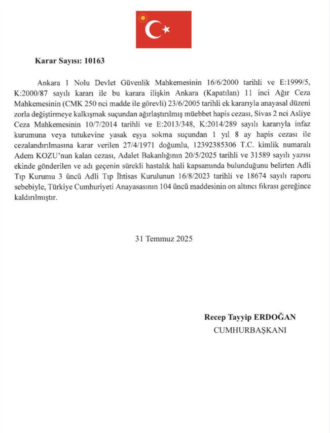 Ancak Adalet Bakanlığı'nın 20 Mayıs 2025 tarihli yazısı ve Adli Tıp Kurumu 3. İhtisas Kurulu’nun 16 Ağustos 2023 tarihli raporuna dayanılarak, Adem Kozu’nun sürekli hastalık hali kapsamında olduğu tespit edildi. Bu gerekçeyle Cumhurbaşkanı Erdoğan tarafından affedildi.