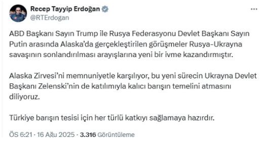 “ABD Başkanı Sayın Trump ile Rusya Federasyonu Devlet Başkanı Sayın Putin arasında Alaska’da gerçekleştirilen görüşmeler, Rusya-Ukrayna savaşının sonlandırılması arayışlarına yeni bir ivme kazandırmıştır. Alaska Zirvesi’ni memnuniyetle karşılıyor, bu yeni sürecin Ukrayna Devlet Başkanı Zelenski’nin de katılımıyla kalıcı barışın temelini atmasını diliyoruz.”
