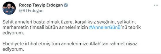 Cumhurbaşkanı Recep Tayyip Erdoğan, şehit anneleri başta olmak üzere tüm annelerin Anneler Günü'nü kutladı.